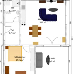 • Zimmeraufteilung: 1 Schlafzimmer mit zusätzlicher Zwischendecke (8,8 m²), großzügiger Wohn- und Küchenbereich in offener Bauweise, Bad