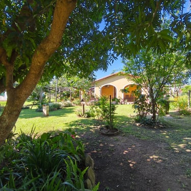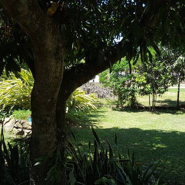 Gepflegter Garten mit vielfältiger Bepflanzung: Mango, Zitrusfrüchte, Papaya, Maracuja, Pflaume