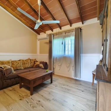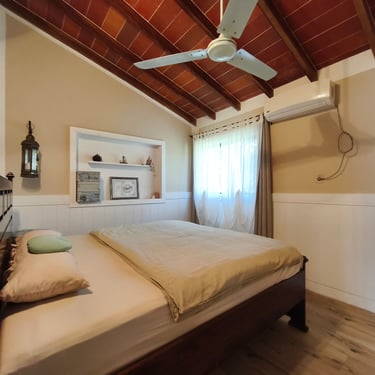 Mehrere Klimaanlagen und große Deckenventilatoren in Wohn- und Schlafzimmer